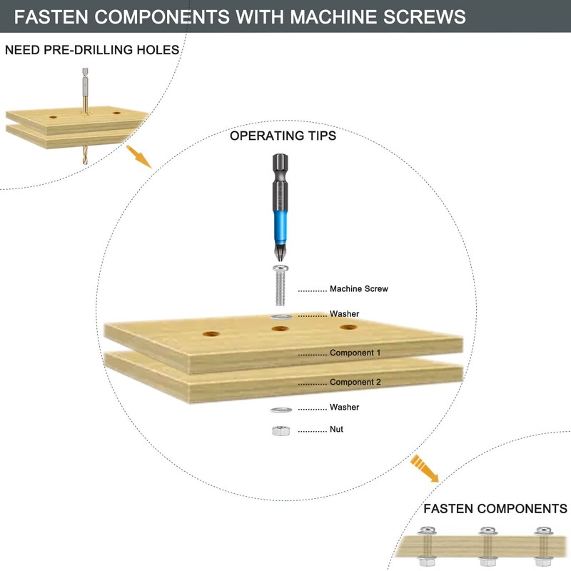 - EASY TO USE: These screws & nuts are packed in a hard cardboard box and a self sealing bag, convenient storage and taking. In case furniture is not pre-punched, use the M4 woodworking drill bit we provided.