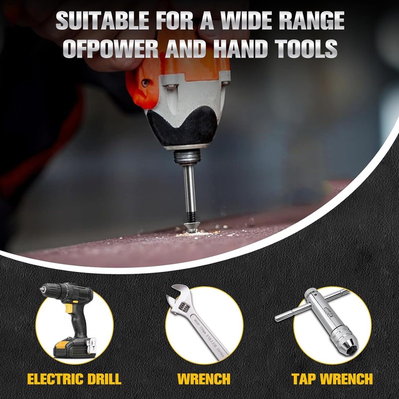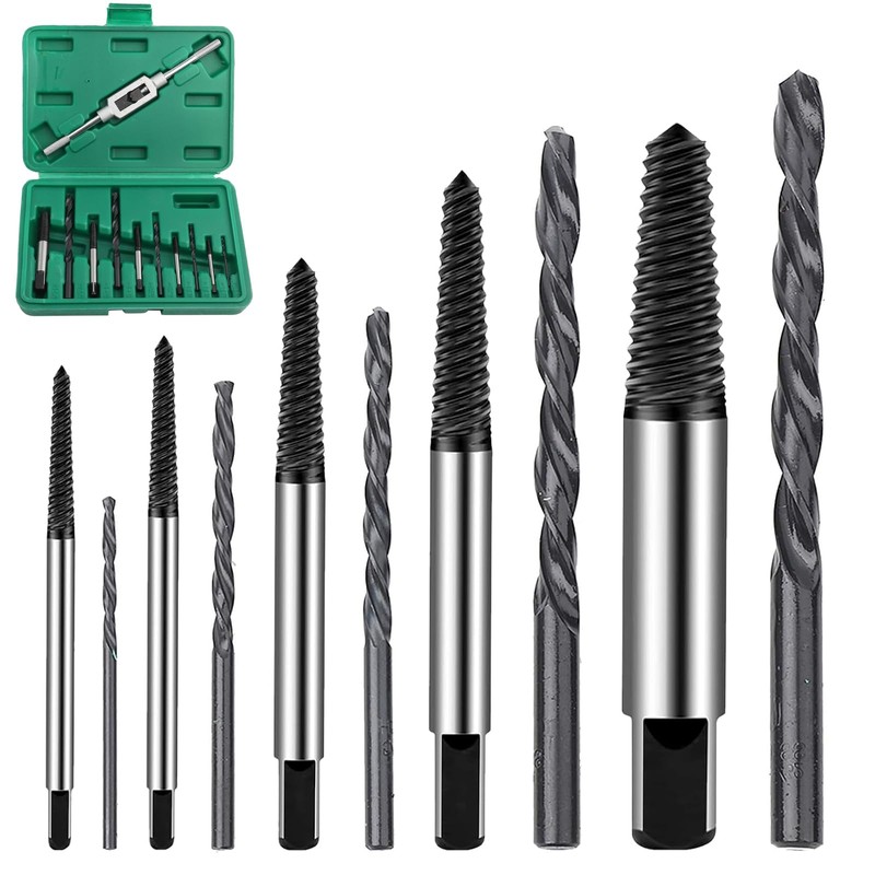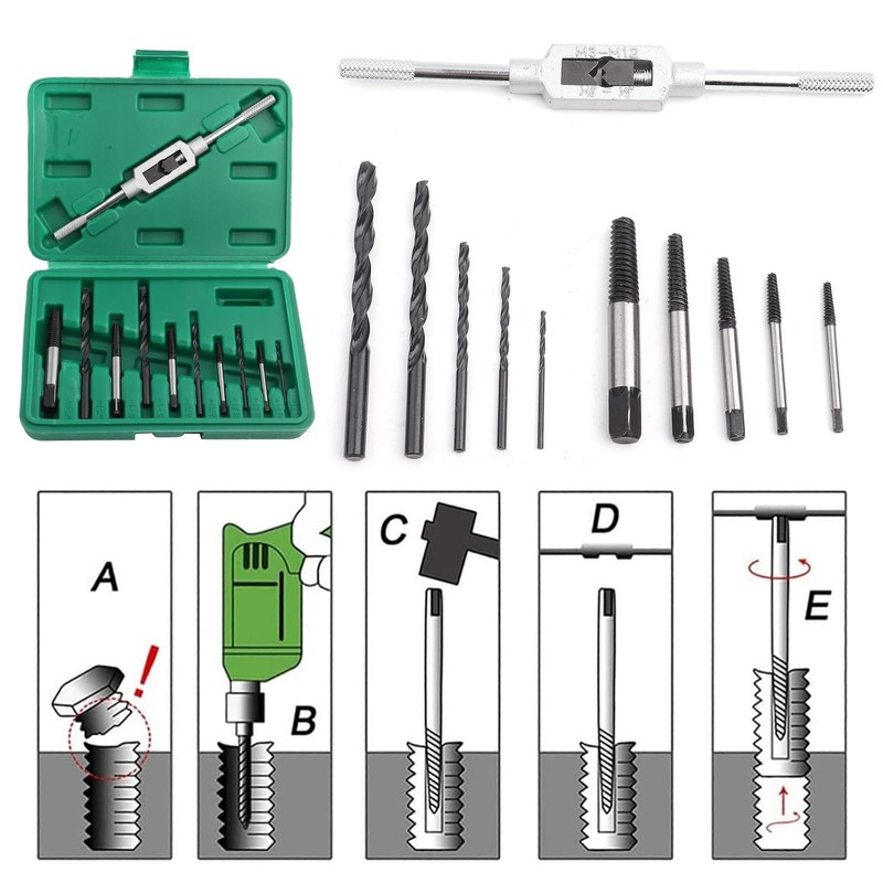 - Volume concept: 11-piece. Left extractor set complete contains everything: 5 x extractors, 5 x double drill bits (diameter 7.5-2.0 mm), 1 x extra long 195 mm tap wrench. No retrofitting required - complete for M3-M12 & 1/8"-1/2". For DIY enthusiasts & professionals.