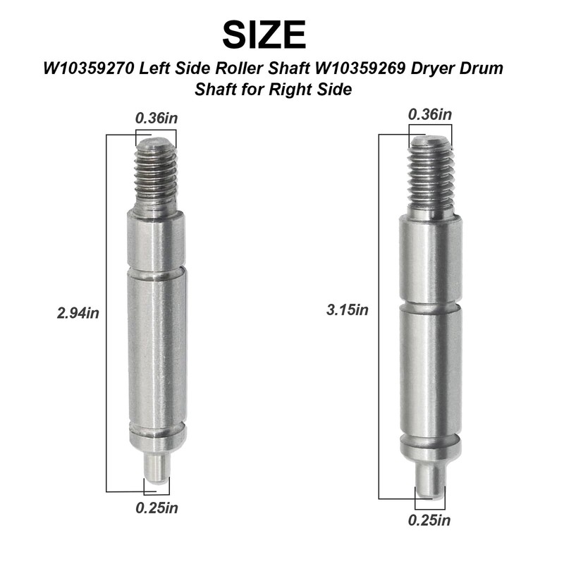 - 【Package Incldes】Dryer Left and Right Side Shafts Kits include 1PCS W10359269 and 1PCS W10359270, 2washers and 2 anti-loose nuts were given away.
