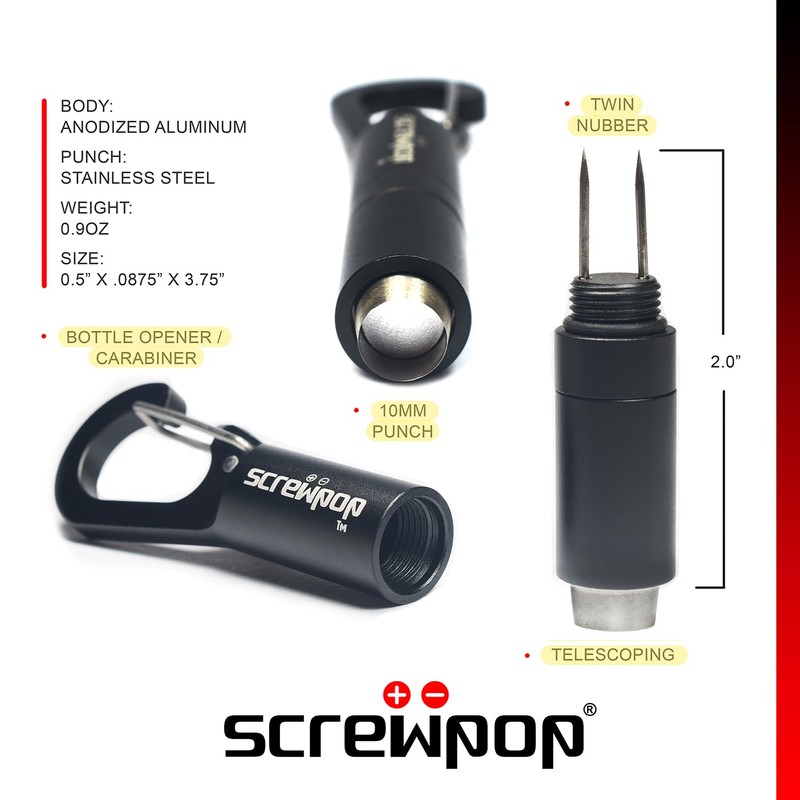 Screwpop Telescoping Cigar Punch 4.0 Ultra-Sharp with Twin Prong Nubber Carabiner Clip Bottle Opener Anodized Black
