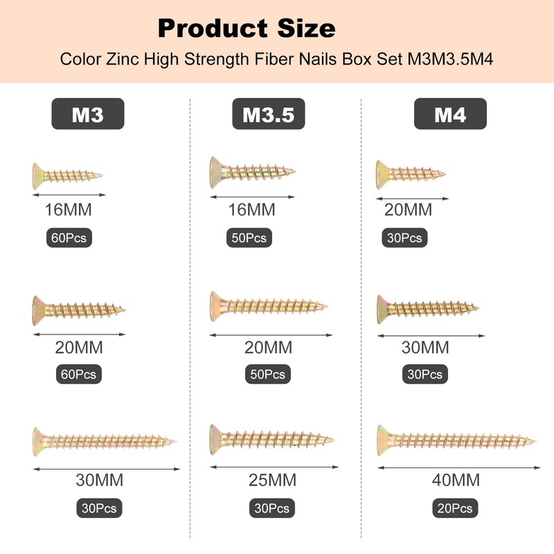 - Screw set: self-tapping metal screws, available in 9 sizes with 360 metal screws, wood screws assortment contains, 60 pieces M3 x 16 mm, 60 pieces M3 x 20 mm, 30 pieces M3 x 30 mm, 50 pieces M3.5 x 16 mm, 50 pieces M3.5 x 20 mm, 30 pieces M3.5 x 25 mm, 30 pieces pcs pcs M4x M420mm, 30 pcs M4*30mm and 20pcs M4*40mm