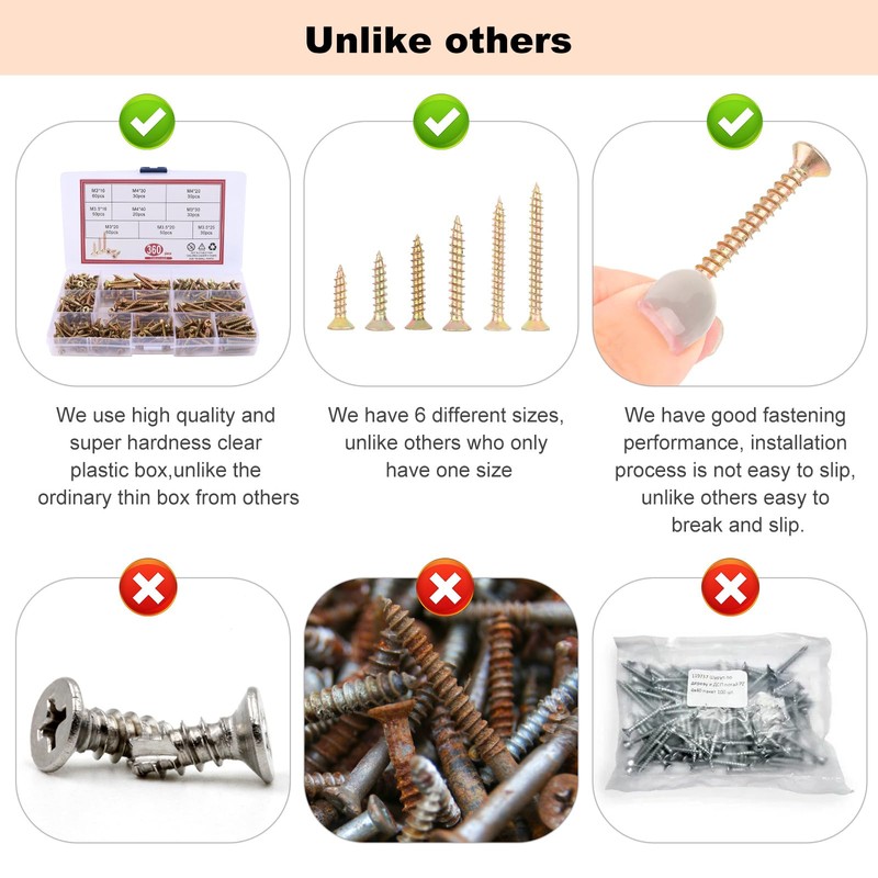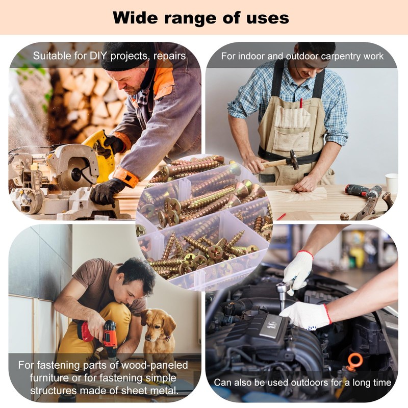 - Easy to store: wood screws set come with a plastic box, lid of the box is equipped with detailed information on the dimensions and offers enough space for all metal screws, screw assortment very practical for selecting suitable sizes, easy to carry and use anytime and anywhere