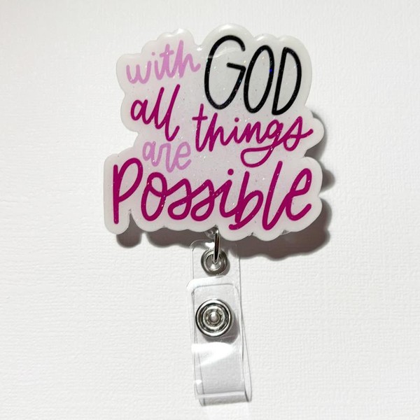 Scripture Badge Reel – Inspirational Bible Verse ID Holder with Optional Glitter, Durable Design for ID, Keys & Cards, Ideal for Christians:_with GOD all things are possible_no