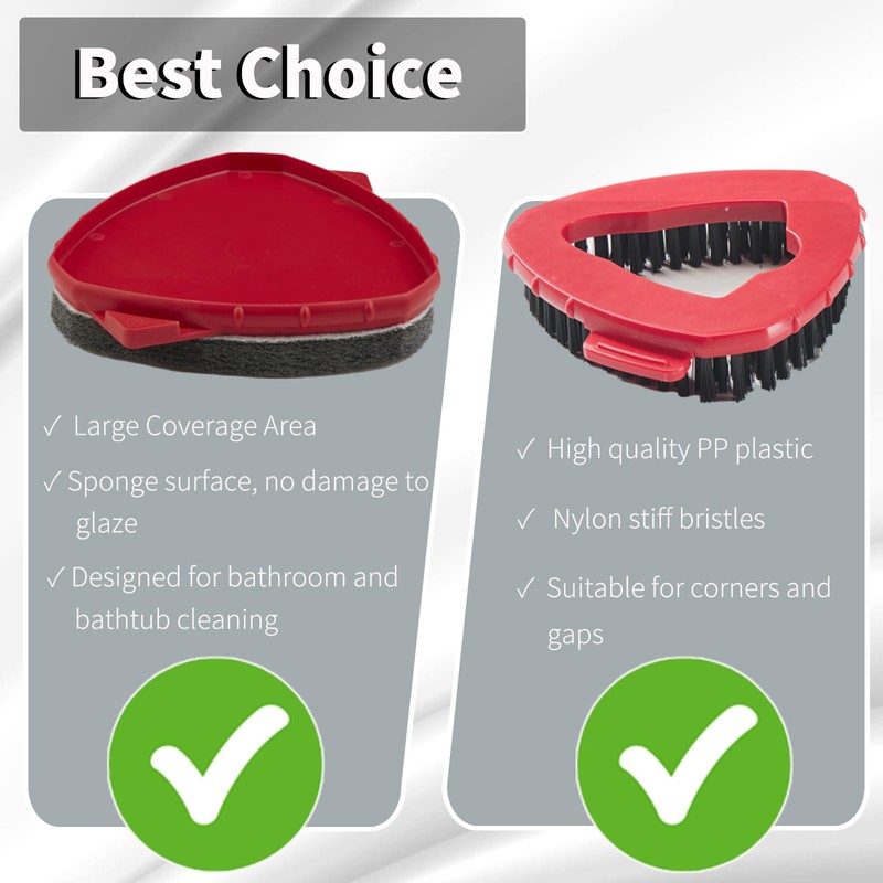 - Widely Used: 2 different brush head that solves all cleaning problem. You can use the stiff brush head to remove the stubborn stains on tile, concrete, wood floor. The shower scrubber sponge brush for cleaning is a great bathroom cleaning supplies for scrubbing bathroom tiles, bathtub, tub, glass, floors, wall, windows, door, sink, mirror, countertop, ceiling and narrow spaces around the toilet