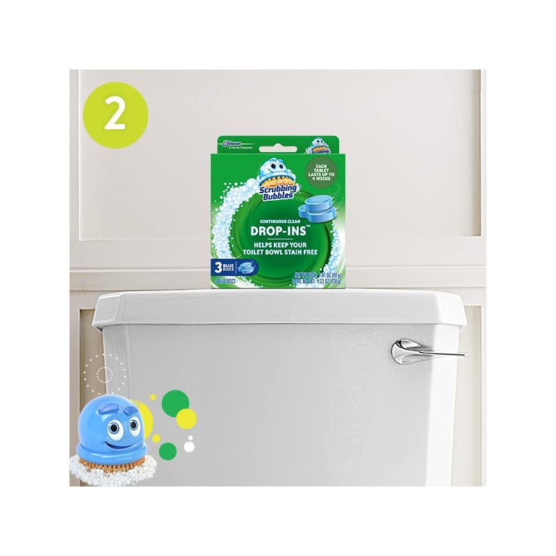Scrubbing Bubbles has just the remedy for toilet rings and hard water stains in the toilet. Introducing Scrubbing Bubbles Drop-Ins. Just drop a tablet into your toilet tank to help keep your toilet bowl stain-free up to 4 weeks. With every flush, your toilet enjoys glorious relief from stains caused by hard water, minerals and limescale. That’s continuous odor protection for a continuous clean. The Scrubbing Bubbles way. Stain and smell protection for your toilet bowl that drops right in. That’s cleaning reinvented. Package includes 3 discs that lasts up to 4 weeks each.