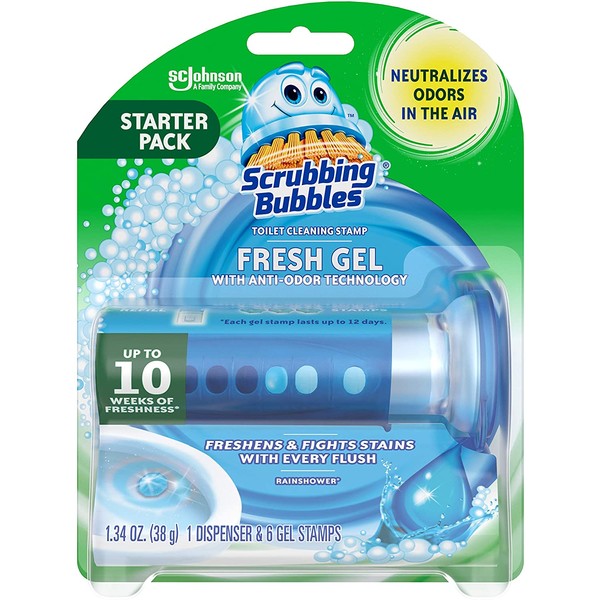Scrubbing Bubbles Toilet Bowl Cleaning Gel Starter Kit, Includes Dispenser and Gel, Glade Rainshower Scent, 6 Stamps