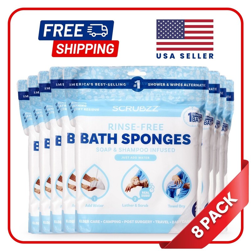 Introducing the Original Scrubzz Rinse-Free Bath Sponge Wipes - an easy and convenient way to stay clean and refreshed without the need for a traditional shower or bath. Perfect for adults, bedridden or elderly individuals, and those with limited mobility, our original formula provides reliable and effective cleansing. Simply add water, lather up the sponge, and cleanse your body with no rinsing required! Scrubzz sponges are soap and shampoo infused, ensuring a thick, bursting lather for head-to-toe cleansing. Hypoallergenic and pH balanced, they are designed to keep your skin healthy and irritation-free. Ideal for travel, camping, hiking, and emergencies, the Original Scrubzz Rinse-Free Bath Sponges ensure you can stay clean and refreshed no matter where you are. Each pack contains 25 wipes and is available in 1, 2, 3, 4, or 8 packs. Experience the convenience and effective cleansing power of the Original Scrubzz Rinse-Free Bath Sponges today!