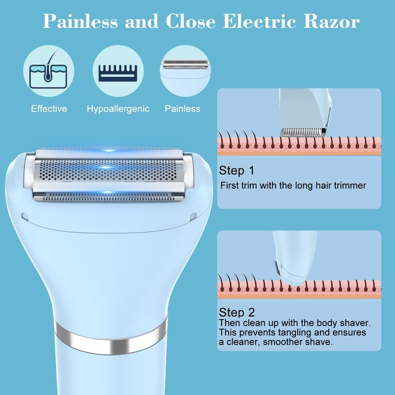- 3-in-1 Bikini Trimmer: This women’s bikini trimmer comes with three highly efficient shaving heads, expertly designed to remove hair on whole body areas. One is body trimmer head, ideal for use on the arms, legs, and other parts of the body. One is detail trimmer head is for precise bikini detailing, and the facial trimmer head for a painless on on the cheeks, chins, and upper lips, providing a comprehensive grooming solution in one compact device