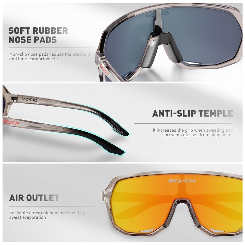 Choose the SCVCN cycling glasses and experience exceptional quality and performance that exceed your expectations. As an independent brand, SCVCN is designed by a passionate team that specializes in the design and manufacture of high-quality bicycle equipment. Our cycling glasses for men and cycling glasses for women are made of high-quality materials that ensure clear vision and optimal eye protection so you can ride confidently. The SCVCN cycling glasses are equipped with powerful lenses that effectively block UV rays and reduce strong light reflections, reducing eye strain. These sunglasses for cyclists provide excellent visual clarity under different light conditions and help you master any driving environment better. Whether mountain biking with MTB glasses or commuting through the city, SCVCN is your ideal choice. Our products not only value functionality in design, but also take into account the user experience in detail. Each SCVCN cycling glasses for men comes with a professional cleaning cloth that makes it easier for you to keep the lenses clean. In addition, the packaging is practical so you can easily transport and protect your cycling sunglasses. With SCVCN cycling glasses, you can safely participate in a variety of outdoor sports, including motorcycling, running, skiing, baseball, volleyball, tennis, road trips, triathlons, fishing, car racing, hiking, climbing, golf, boating and hunting. Whether you need MTB sunglasses men or road bike glasses men, SCVCN offers you the perfect viewing experience and reliable protection. SCVCN is always committed to providing cyclists with high-quality products with high performance. Choose SCVCN to start your bike ride and make every moment clear and exciting!