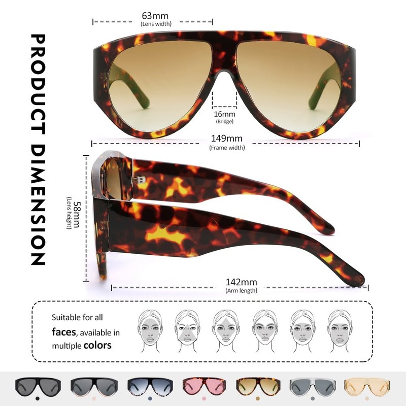 - Dimensions and Packaging - Lens width: 63 mm, Lens height: 58 mm, Bridge: 16 mm, Arm: 142 mm, Frame Width: 149 mm. We also equipped the womens oversized sunglasses with a microfiber cloth, a microfiber bag, a screwdriver to adjust the sunglasses and a nice gift box. This is the best gift you can give to yourself and someone you love.