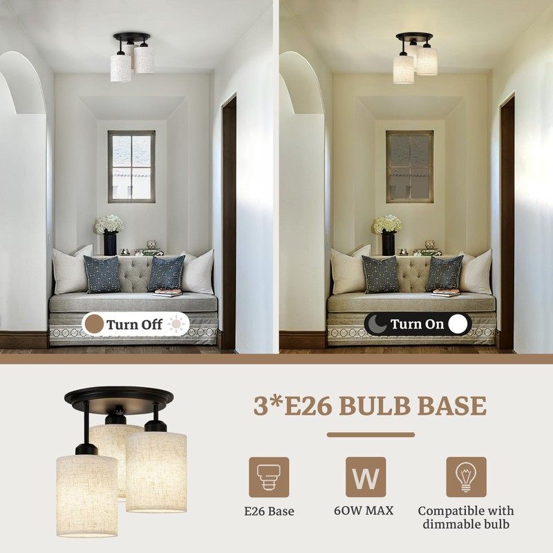 - Modern Farmhouse Semi Flush Mount Design:This 3 light flush mount ceiling light showcases a clean-lined silhouette with fabric drum shades, perfect for modern farmhouse, transitional, or minimalist spaces. A stylish and functional lighting solution that enhances your hallway, bedroom, or entryway.