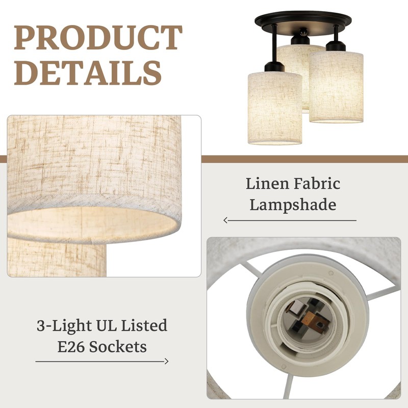 - Premium Linen Fabric & Sturdy Metal Base:Featuring three soft, fabric drum shades in neutral linen texture, this ceiling fixture offers a warm, diffused glow that complements both cozy and contemporary interiors.The durable black metal canopy adds a subtle contrast while ensuring structural integrity and long-term use.