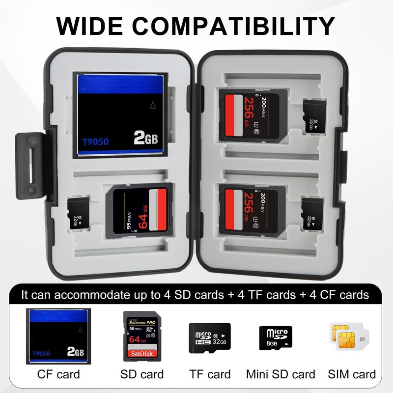 - Large Capacity: This SD card holder case is designed to hold up to 4 SD cards,4 CF cards and 4 TF cards. The sd card case is perfect for photographers, videographers, and tech enthusiasts, this case ensures your memory cards are organized, secure, and easily accessible, whether at home or on the go.