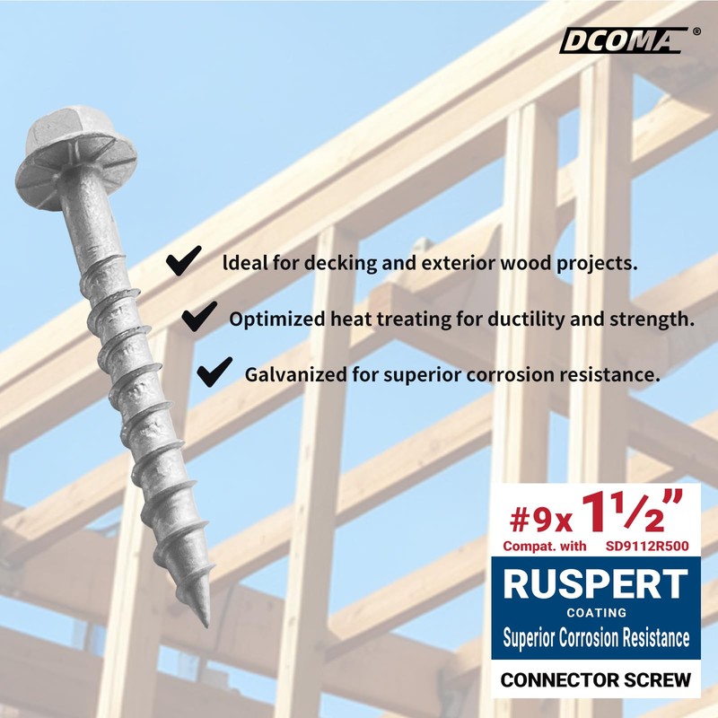 - 【Specific Design】DCOMA connector screw, 9 x 1-1/2 in. 1/4" hex head with 0.370"-dia. used to replace 10d nails, and the single fastener load capacity of the SD9 exceeds the capacity of a common 10d nail, so you can buy it with confidence.