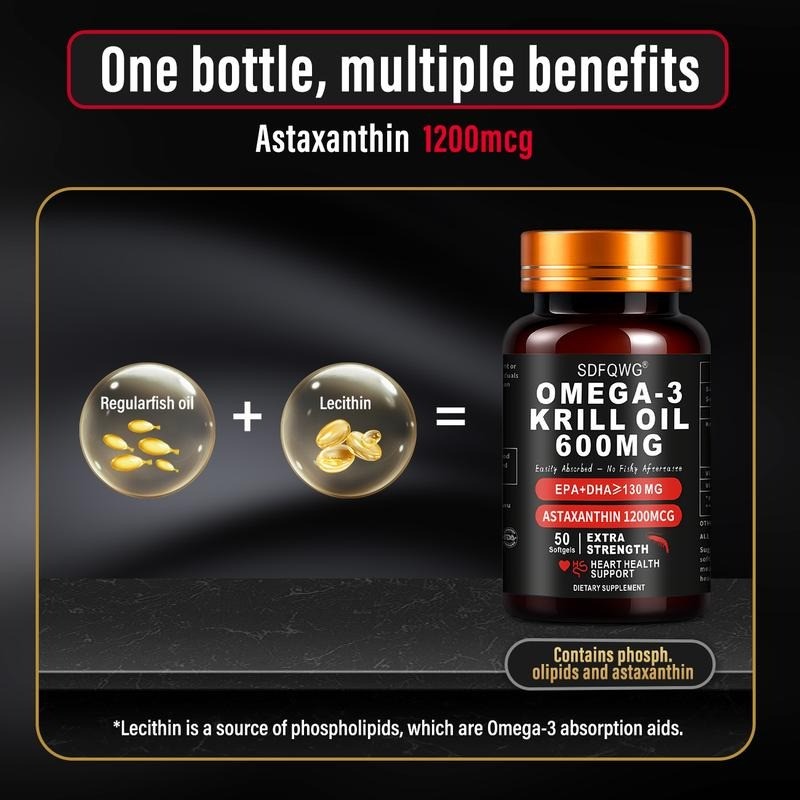 SDFQWG Antarctic Krill Oil 600mg – High-Potency Omega-3 Supplement with Astaxanthin 1200mcg, EPA & DHA | 50 Softgels for Heart & Cardiovascular Health