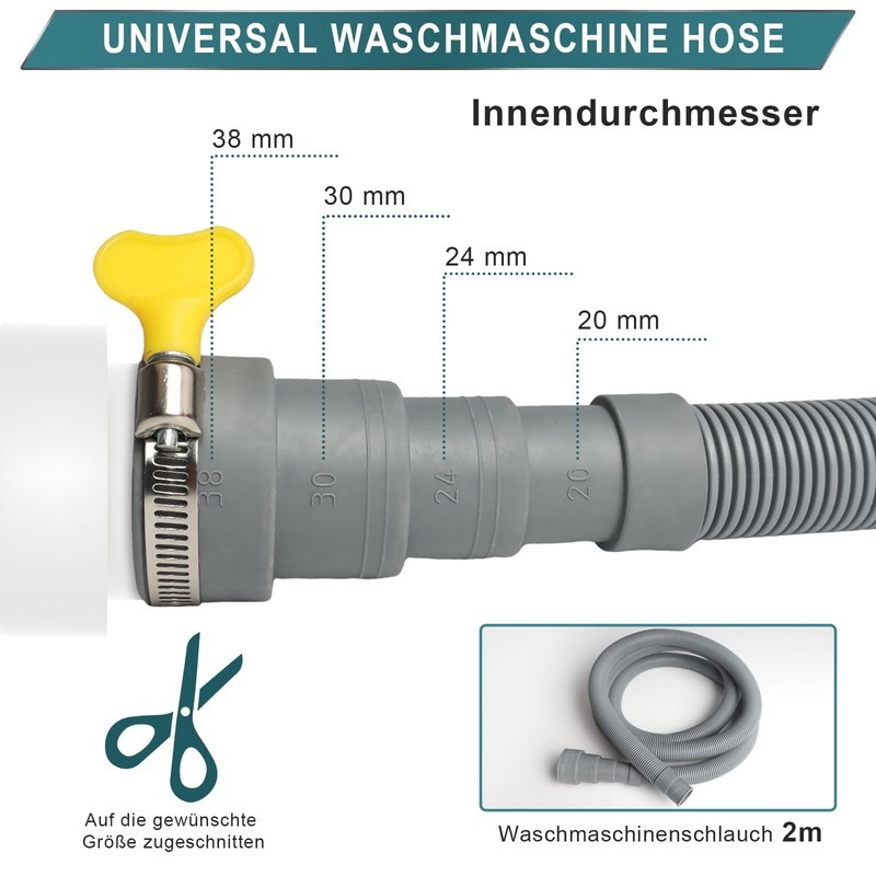 - Easy installation: the installation of the washing machine drain hose is possible without tools. Simply plug in the sewer hose and connect it. For a drain hose extension, add only the adapter and hose clamps.