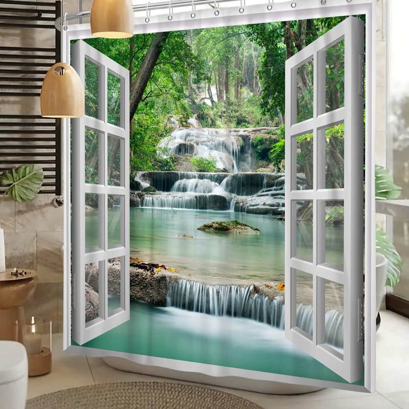 SDOTPMT Shower Curtain with Window View Spring Waterfall Trees Wilderness Landscape Bathroom Curtain White Window Picture Modern Art Fabric Waterproof Bathroom Curtain with Hooks, 180 x 180 cm