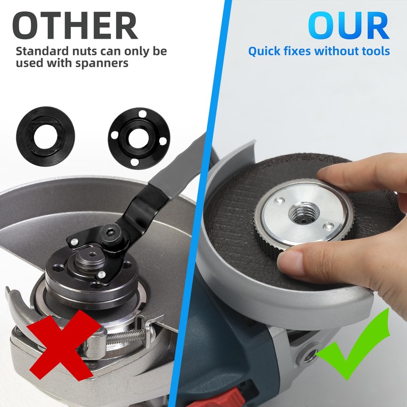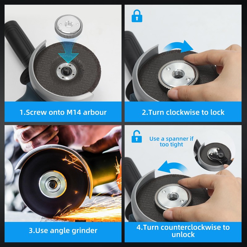 - Tool-free: the quick release nut has a self-locking design and the angle grinder disc can be quickly replaced without additional tools. Turn clockwise to lock, counterclockwise to release