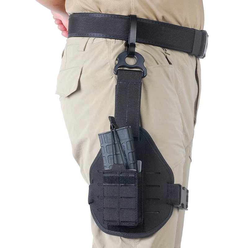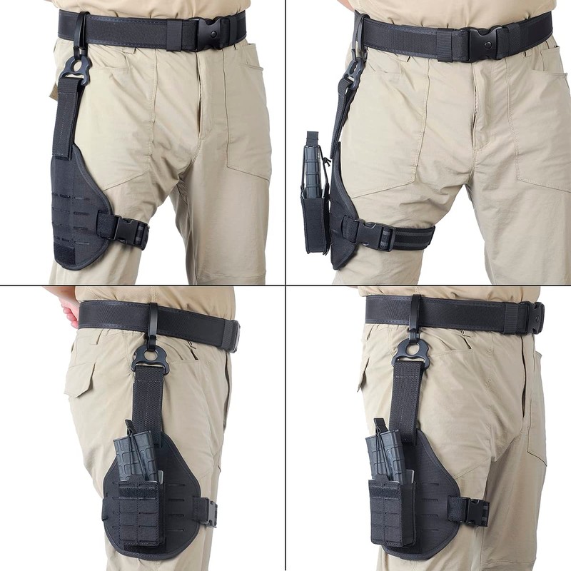 Tactical leg suspension for attach extra useful magazine pouch,first aid pouch,flashlight pouch, water bottle pouch,dump pouches or any other on the panel to extend your storage space.