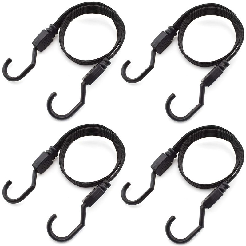 - Package includes 4pcs Flat Bungee Cords with Hooks, can spread pressure along a greater surface area and prevent denting and cutting into cargo/boxes/luggage etc. compared to normal bungees.