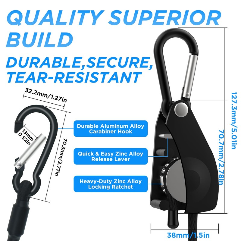 - ใ๐๐ญ๐ซ๐จ๐ง๐ ๐๐จ๐๐ ๐๐๐๐ซ๐ข๐ง๐ ๐๐๐ฉ๐๐๐ข๐ญ๐ฒใThe rope ratchet with reinforced carabiner hooks are durable, tear-resistant, and rust-proof, each rope with a weight load capacity of up to 150 lbs per ratchet. It has stronger carrying capacity and can meet your higher requirements