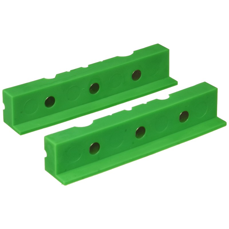 The SE VJP61MP 6" Multi-Grooved Bench Vice Jaw Pads with Embedded Magnets (2-Pack) can grasp metal, plastic, threaded objects, tubing, vises, wood, or anything flat, irregular, or round. The embedded magnets keep vice jaws or pads firmly in place. The grooves' holding slots keep objects in place. The 90 degree angles are for widths of 1/16", 1/8", 1/4", and 3/4". The 60 degree angle is for width of 13/32". The material is green and made from thermoplastic polyurethane (TPU), and the vise jaws are hard enough to keep items in place, yet soft enough to protect surfaces from damage.