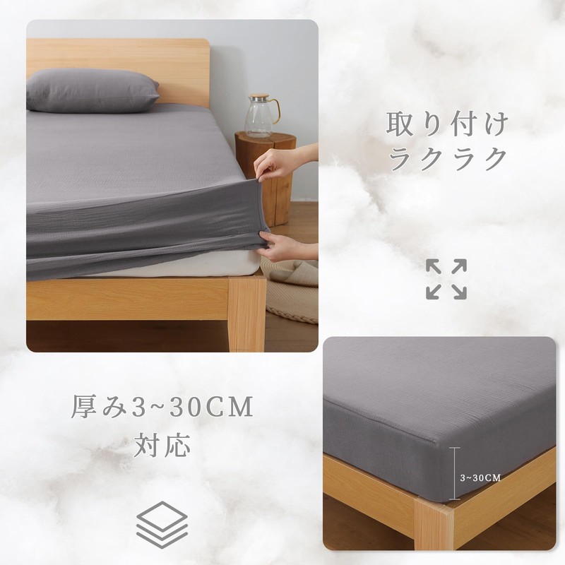 - (Easy to Put on and Stress-Free) The back of the sheet is equipped with rubber that prevents slippage around the entire sheet, making it easy to put on and take off. It will perfectly hug the corners of your mattress and fits perfectly over western bed mattresses as well as Japanese futons. It provides a comfortable feel without worrying about it slipping during repeated tossing and turning. Recommended for women who live alone, or those who have trouble with maintenance