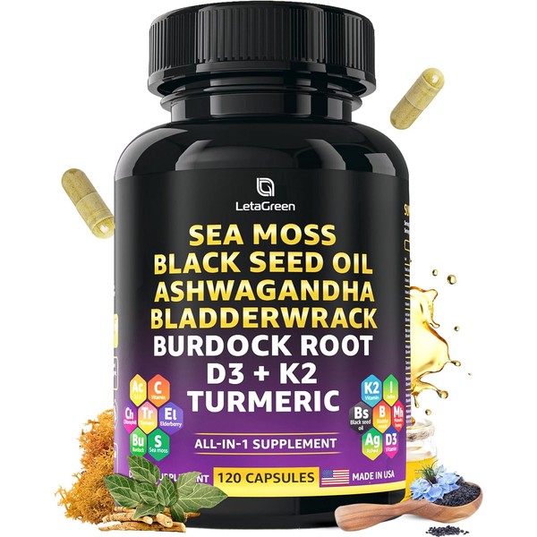 Sea Moss Black Seed Oil Ashwagandha Bladderwrack Burdock Turmeric & Vitamin C, D3, K2 with ACV Elderberry Manuka Honey Dandelion Yellow Dock Iodine Chlorophyll 120 Count