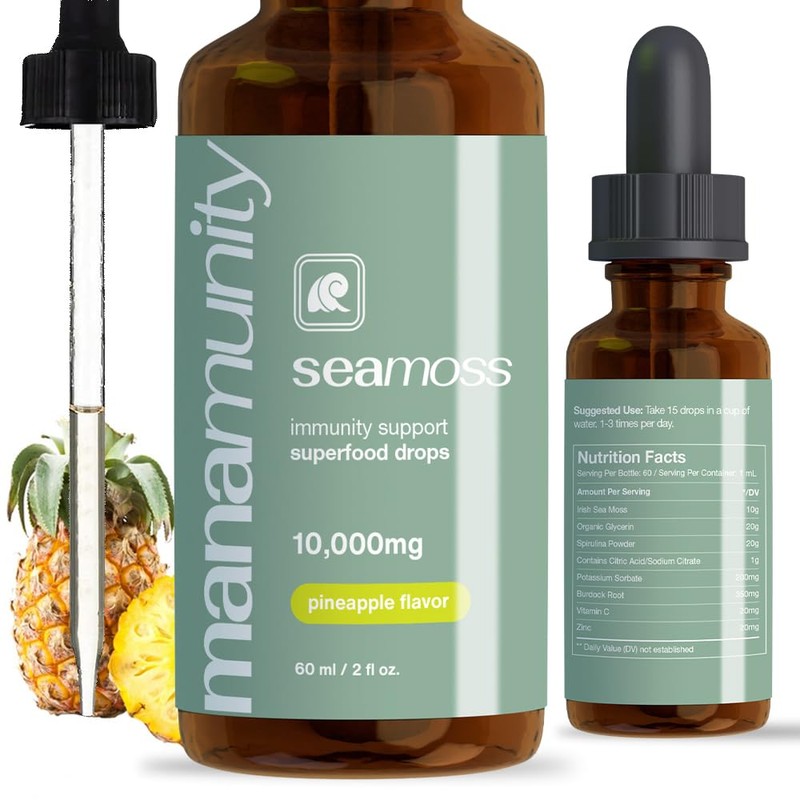 - Elevate your wellness journey with our potent organic Irish sea moss liquid drops. This powerhouse formula boasts an impressive 10,000 mg of Irish sea moss, 350 mg of burdock root, and 20,000 mg of spirulina powder, providing a rich source of essential vitamins and minerals for optimal nourishment.