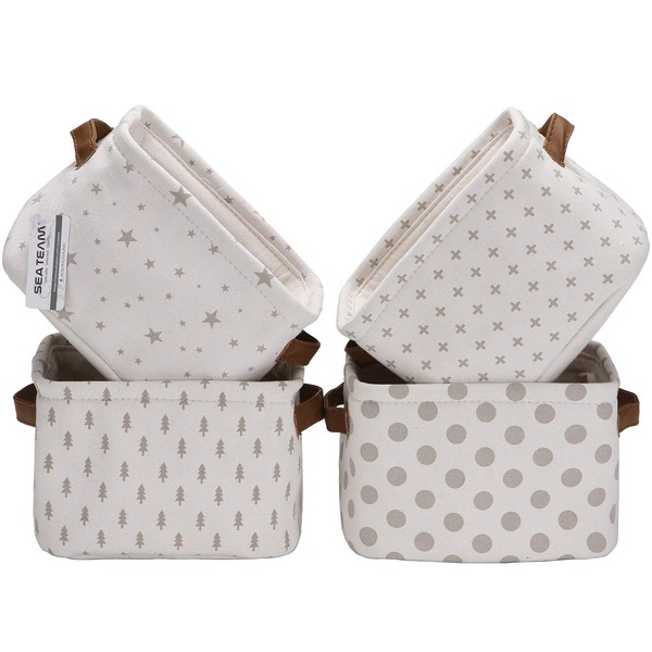 Sea Team Collapsible Small Canvas Fabric Storage Basket with Handles, Square Mini Storage Box, Cube, Foldable Shelf Basket, Closet, Desk Organizer for Nursery, Home, Office (Grey, Set of 4)