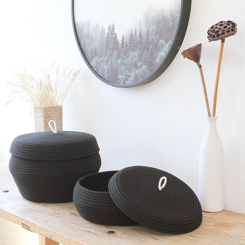 Sea Team Round Cotton Rope Storage Basket with Lid, Decorative Woven Storage Bin, Pot, Caddy, Organizer, Container for Snacks, Towels, Plants, 13 x 5.5 Inches (Large, Shallow, Black)