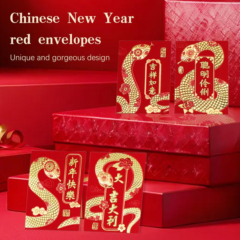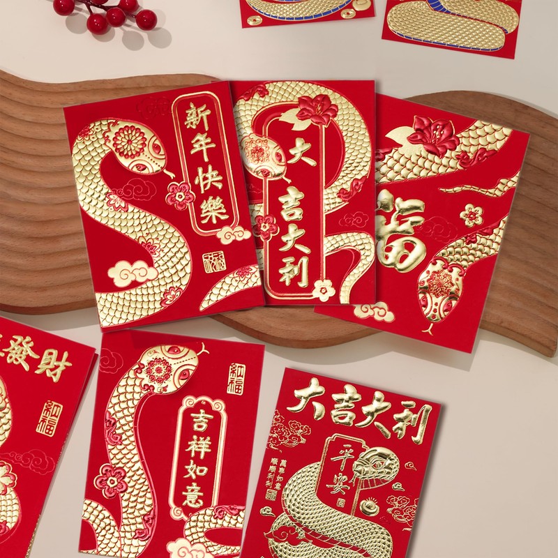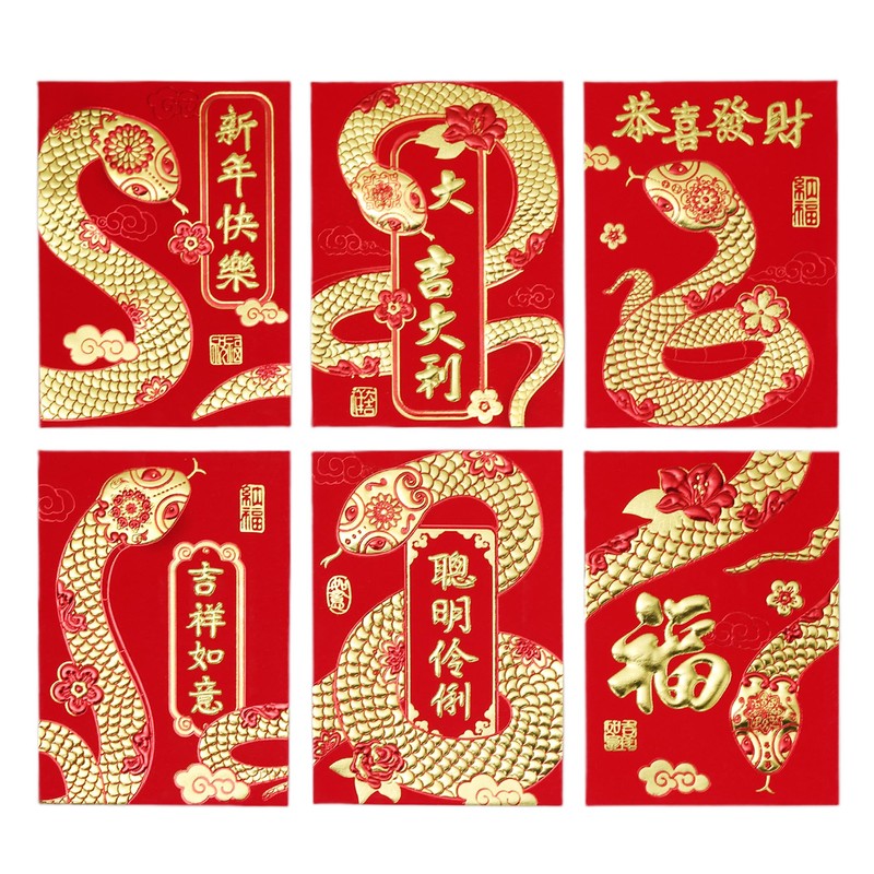 - 6 Unique Gold Embossed Patterns - Celebrate the Year of the Snake 2025 with a variety of six beautifully designed red envelopes, each ampaw/ampao showcasing intricate gold embossing inspired by traditional Chinese art.
