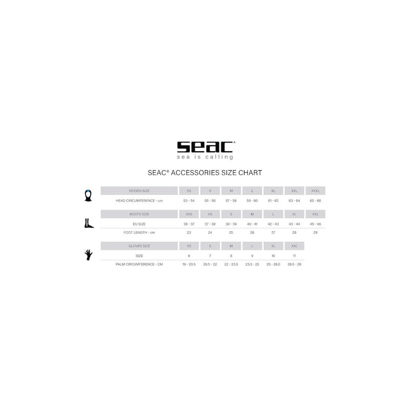 • The gloves for divers, freedivers and underwater fishermen Seac Ultraflex are available in 6 sizes, from XS to XXL (palm circumference: XS 19-20.5 cm, S 20.5-22 cm, M 22-23.5 cm, L 23.5-25 cm, XL 25-26.5 cm, XXL 26.5-25 cm. 8 cm)