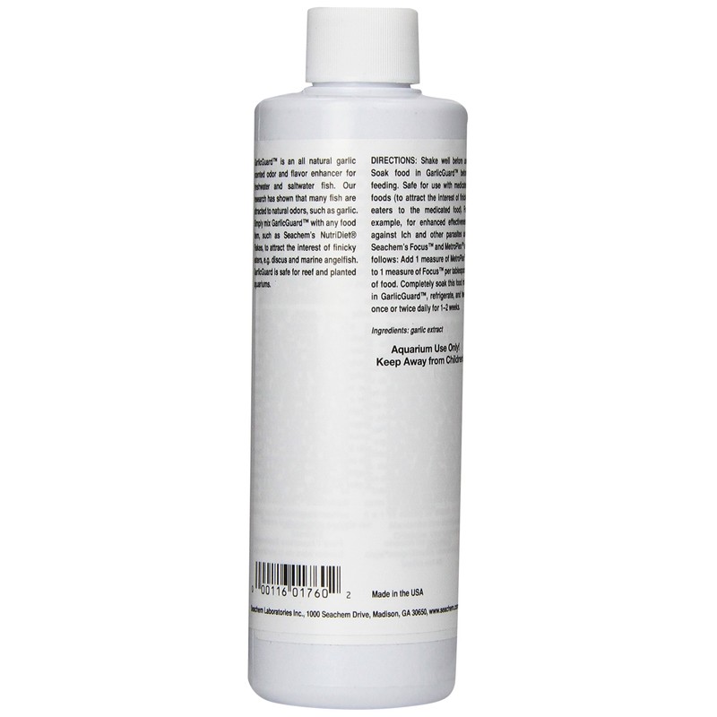 Seachem GarlicGuard is an all natural garlic scented odor flavor enhancer for freshwater and saltwater fish. Research has shown that many fish are attracted to natural odors, such as garlic. For over three decades, Seachem has been a company rooted in sound science. Our experience in the hobby and an educated staff of chemists and biologists are part of the package when you purchase Seachem products. Seachem remains as one of the few surviving independent and privately owned pet care companies. Seachem is owned and operated by _hobbyists_. All of our employees are hobbyists who maintain aquariums at home and at the office. Seachem itself was started because one such passionate hobbyist - Dr. Leo G. Morin (Founder) - recognized that the available solutions to aquarists problem wanting. This resulted in Seachem’s very first product: Cupraplex (today known as Cupramine). Over thirty years later Seachem is still approaching old problems in a new way. Seachem’s philosophy is that the knowledgeable hobbyist makes the best customer. This is reflected in solid and reliable customer education and support as well as products proven in science and performance. While Seachem has grown rapidly into a national and international firm, it retains the culture of a small company and is readily available to its customers.