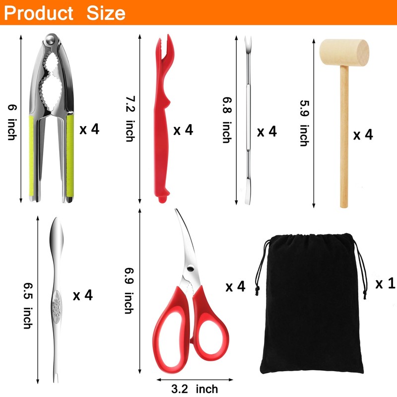 - 25 Pcs Seafood Tools Set: This kit includes any essential to enjoy your seafood feast -- 4 crab crackers, 4 lobster shellers, 4 seafood forks, 4 wide crab forks, 4 seafood scissors, 4 crab hammers and 1 storage bag.