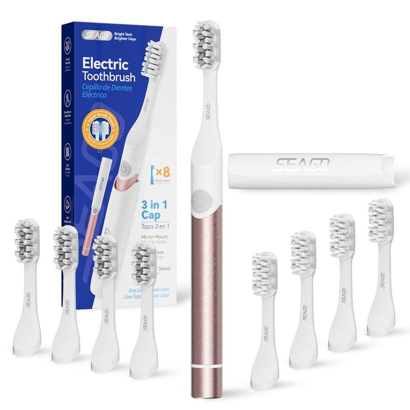 SEAGO Electric Toothbrush for Adults Teeth Clean,3 in 1 Cap and 8 Pieces Brush Heads,Soft Bristle, Smarter Timer, Battery Travel Toothbrush (Rose Gold, Middle)
