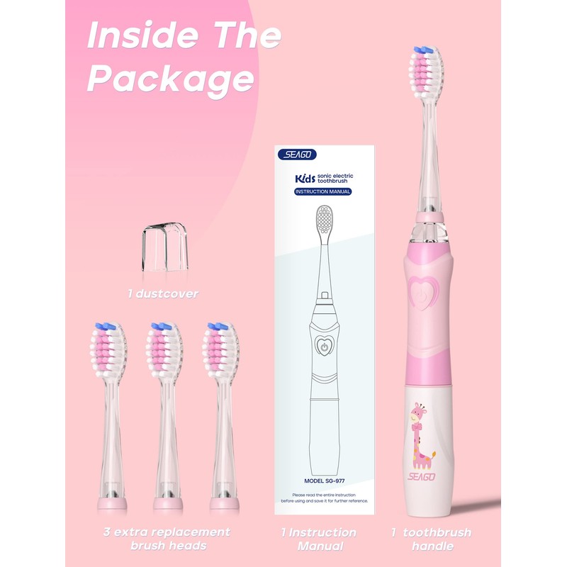 SEAGO Kids Electric Toothbrush with 2 Mins Timer and 4 Replacement Bursh Heads, Rainbow LED Light Make Brushing Fun, Pink Color Girls Battery Powerd for 4-12 Years Old,SG-977