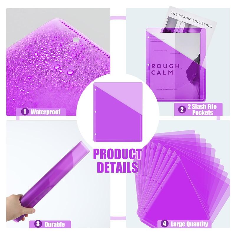 • Convenient Slash and Hole Design: the 3 ring binder plastic sleeves are designed with convenient slashes that allow you to easily slip in your documents; The edge with 3 punch holes allow you to easily add the file jackets to the binder without punching holes, making it easier to organize and access your documents
