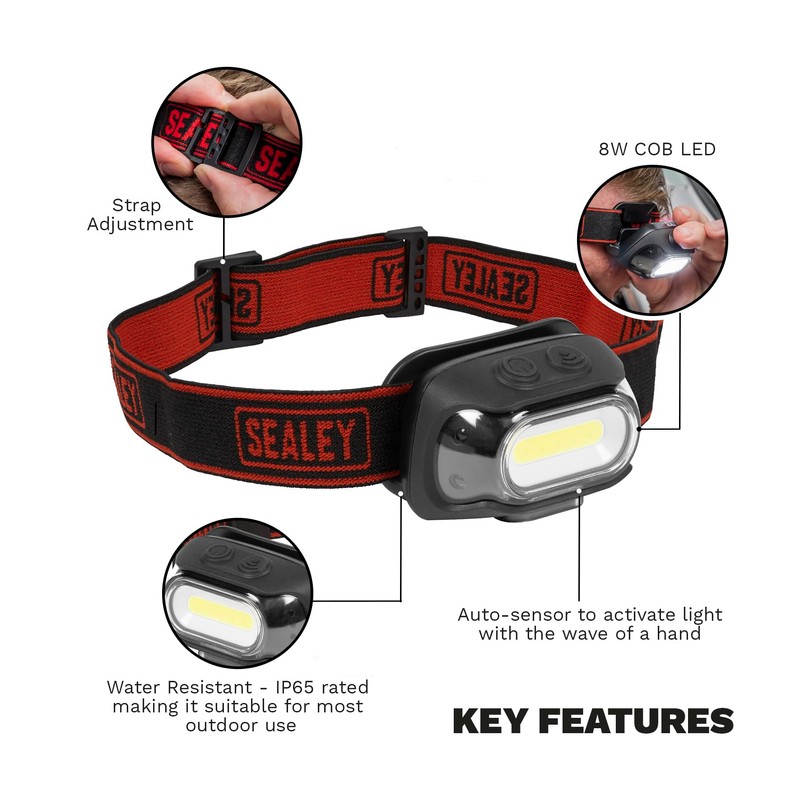 Sealey Rechargeable Head Torch with Auto-Sensor, 8W COB LED, 500lm - HT08R