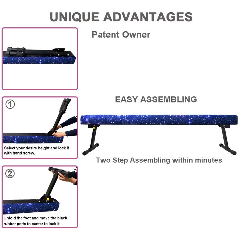 - 【SUPER EASY!! ASSEMBLING&STRONG】We have patents in our hands!! After 1 year of modification and experiment. We have successfully studied this Adjustable&Foldable balance beam. No tools required. It can be quickly folded and adjusted to the height you want. It is strong enough. Up to 300 pounds. And we will give it more beautiful patterns. Coming soon!