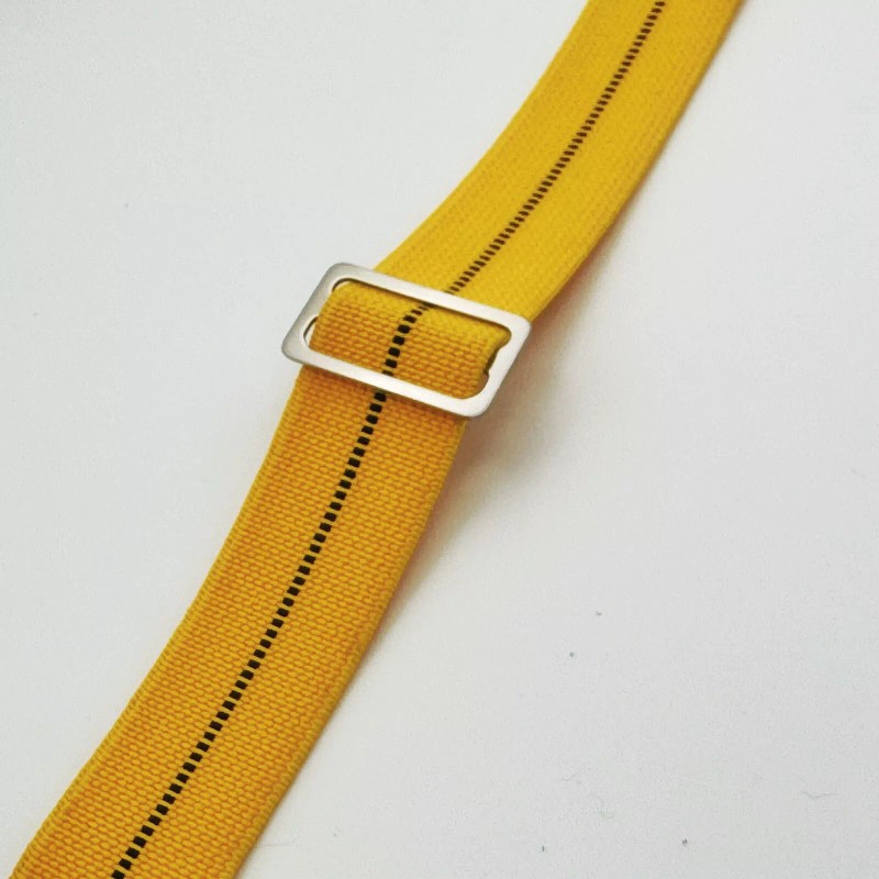 Elastic watch straps made from classic parachute band material, in Yellow with Black Stripe and brushed steel hardware. Each watch band employs a hook and loop style system. The sliding steel "loop" adjusts easily with limited resistance while providing a snug, tight or loose fit on demand.