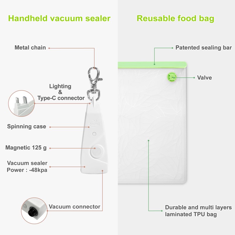 - 【Reusable Food Bags & Eco-Friendly】- These reusable and durable seal food storage bags are BPA-free and made of eco-friendly material with GRS certified (Global Recycled Standard) from the highest quality for washable and reusable. This reusable food storage bag is saving the environment and reduces plastic waste, and also supports heat up to 176˙ F (Don’t over the temperature of 176˙F). The reusable bags and battery-free design make your carbon footprint a little smaller.