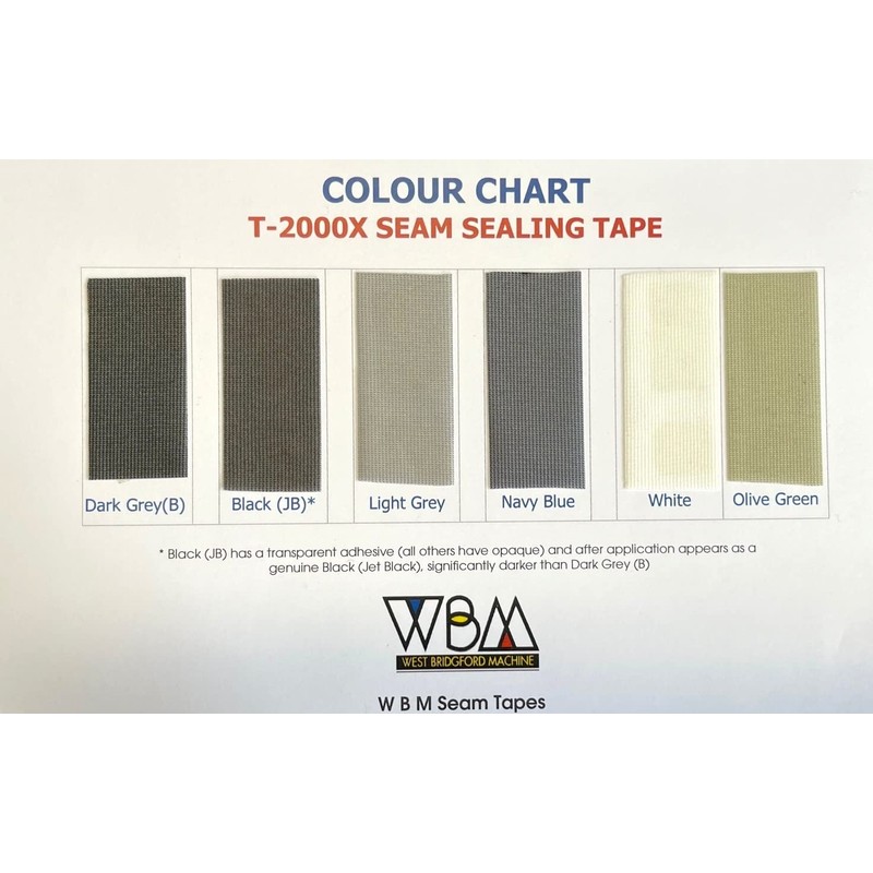 Description: T-2000X hot melt Seam Sealing Tape - Nylon 66 Tricot backer. Widths available: 22mm all colours; 28mm Dark Grey. Note that Tape colours are not bold*(see colour chart).