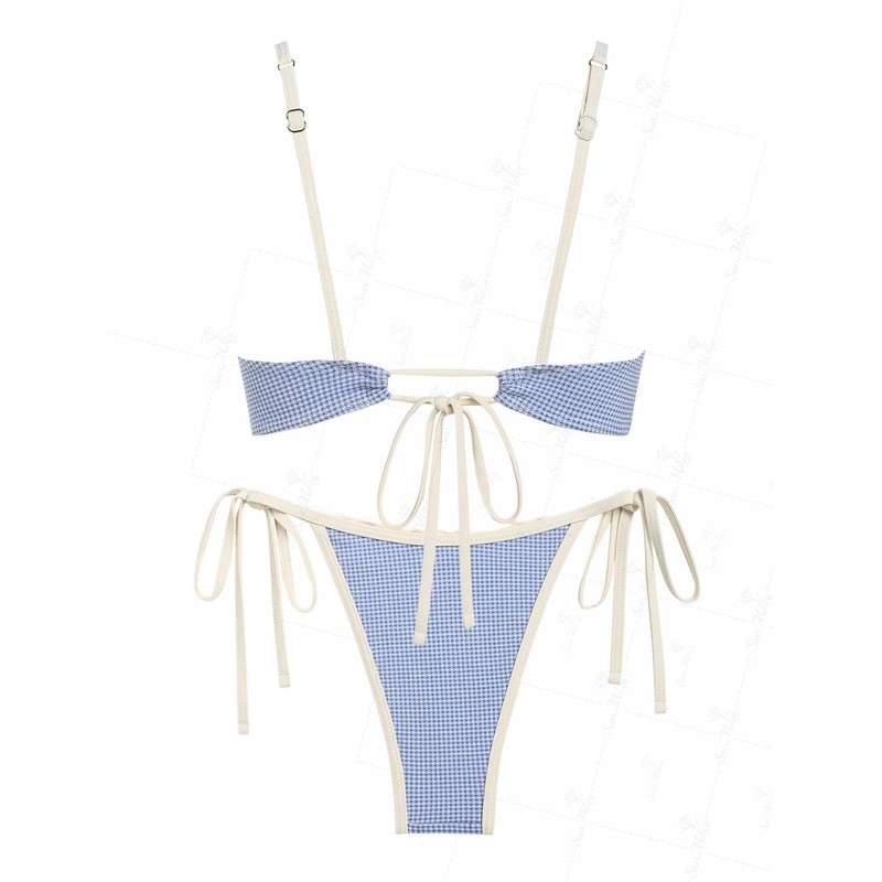 seamoly Gingham Spliced Ruched Ruffles Trim Bowknot Decor Tie Side Bikini Set...