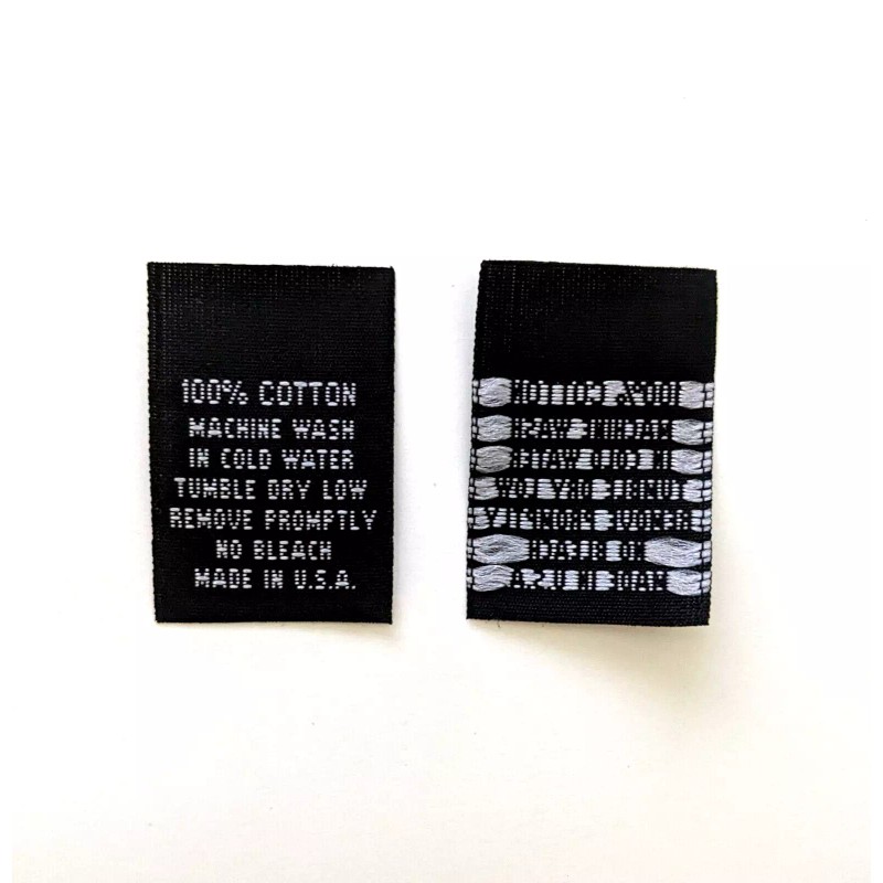 THESE ARE PROFESSIONAL QUALITY LABELS MEASURE 1 INCH by 1 1/2 INCH, BLACK WITH WHITE LETTERING. THESE ARE SEWN INTO GARMENTS. THESE WILL NOT FRAY. |