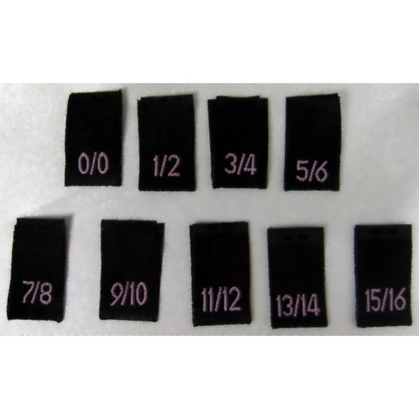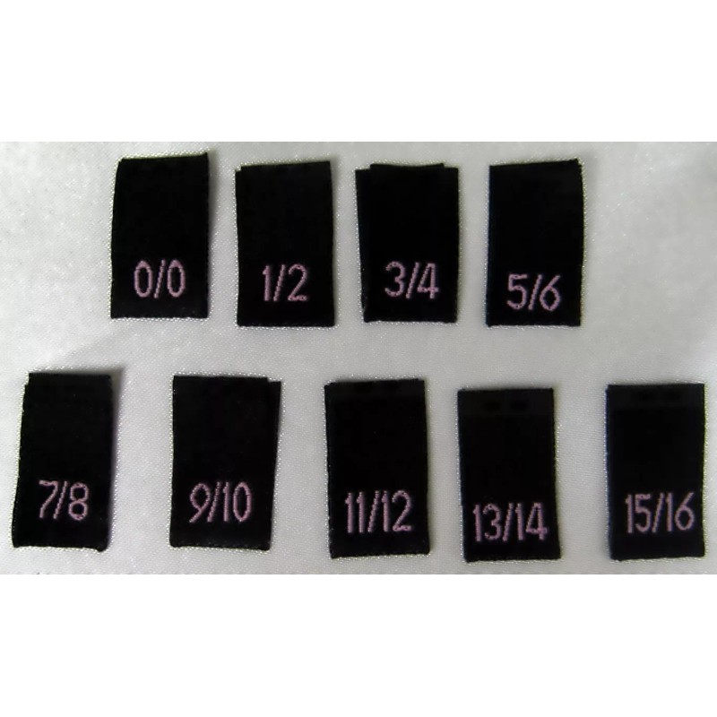 MIXED LOT OF 250PCS BLACK PINK WOVEN SEWING CLOTHING LABELS SIZE TAGS SIZE 0/0, 1/2, 3/4, 5/6, 7/8, 9/10, 11/12, 13/14, 15/16 28 EACH SIZE 250 PIECE TOTAL.