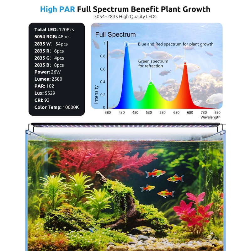 - 🐟 High PAR Full Spectrum: Suitable for thriving plants, optimized full spectrum and enhanced red/blue wavelengths maximize photosynthesis. Achieve lush plant growth and vibrant coral/fish colors with up to 90% light penetration. LED QTY: 120Pcs (W:54Pcs/R:6Pcs/G:4Pcs/B:8Pcs/RGB:48Pcs). PAR: 102, Lux: 5229, Lumen: 2580, Color Temperature: 10000K, CRI: 93.