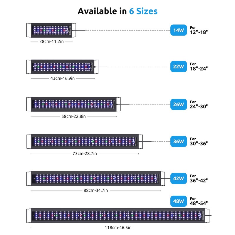 Experience professional-grade aquarium LED light with the SEAOURA SR-659 Full Spectrum LED Light. Engineered with premium 5054 & 2835 LED chips, it delivers red and blue wavelengths for maximum plant growth photosynthesis and vibrant aquarium colors. Enjoy 10 preset lighting modes plus advanced WRGB custom lights with 0% to 100% brightness adjustment.