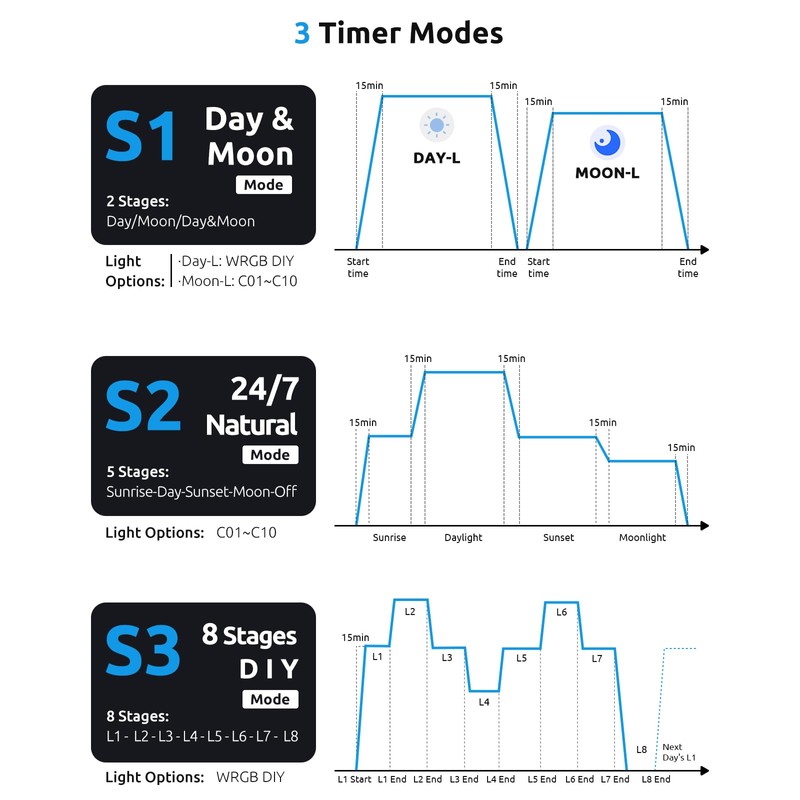 - 🐟 3 Timer Modes: Aquarium Light offers 3 custom timer modes for you to choose from. S1: DAY-L (WRGB) / MOON-L (preset color), the two lights can be turned on separately or alternately on the same day. S2: 24/7 natural mode (5 stages, preset colors). S3: DIY mode (8 stages, WRGB). Timekeeping mode will automatically adjust brightness and color based on your local time, with a 15-minute gradient between light transitions to avoid scaring the aquatic creatures.