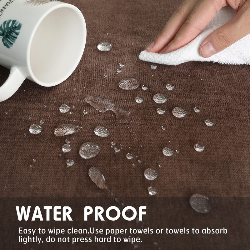 - WATERPROOF TABLE COVER:With the lastest technology, the faux linen tablecloth has excellent water resistant ability. Spilled coffee, wine or milk beads up on surface of the them, and not easy to penetrate into the fibers. You can absorb the droplets by napkin paper. and you NO LONGER need to change and wash the table cloth every day